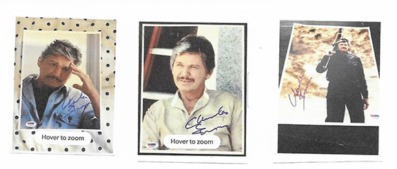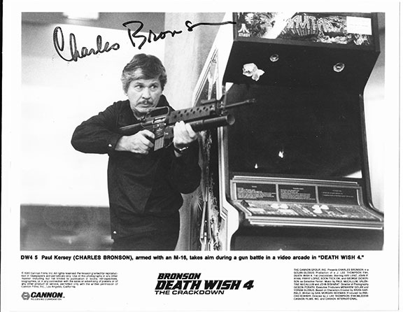 BRONSON, Charles (1921-2003) American actor, usually played the part of a tough guy. Signed photograph, 8”x10”, B&W from “Bronson Death Wish 4, The Crackdown”. Portrait, half length pose of Bronson ready to shoot his M-16 during a gun battle in a video arcade. Cannon Films, 1987. Very boldly signed “Charles Bronson”. Genuine signatures of Bronson can be considered very scarce. We did a run through eBay on July 7, 2021 and 59 said to be signed items were up for sale, many with the useless ABC type authenticating company stickers. Of the 59 items, in our opinion only four contained genuine signatures. SEE BELOW SAMPLES OF FORGED SIGNATURES STICKERED AS GENUINE. In fine condition........SOLD