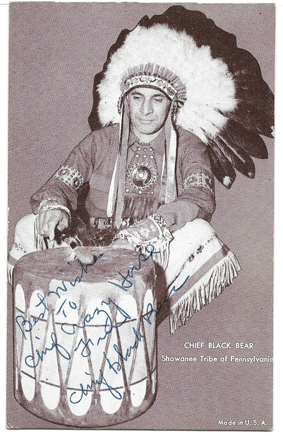 Chief Black Bear.  Chief of the Shawanee Tribe of Pennsylvania. Postcard sized photograph of the Chief in full Indian dress playing his Tom Tom. Inscribed: Best wishes to Chief Crazy Horse from Chief Black Bear,” Most unusual......