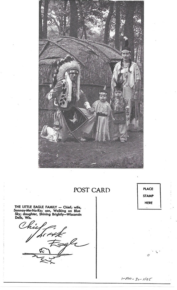 Chief Little Eagle. American Indian Chief. Postcard photograph, B&W, of the Chief in full Indian dress holding his bow. He is kneeling next to his family in front of their hut. Boldly signed in ink on the verso both in script and pictograph........$95.00![]() |