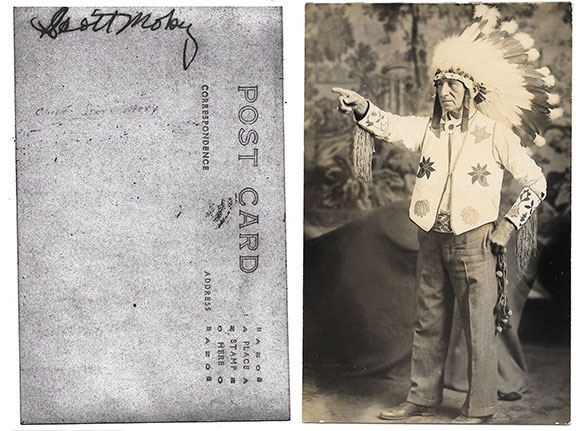 Chief Scott Moby. .American Indian Chief. Postcard photograph of the Chief in full Indian dress, full length pose, pointing. Signed on the verso, in script. A fine example..................................$67.50