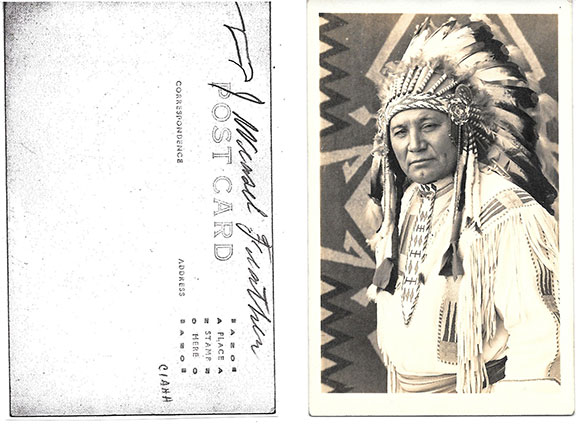 Chief Weasel Feather.  American Indian Chief. Postcard photograph, B&W, half length pose in full dress looking into the camera.  Signed on verso in pencil in both pictograph and script................