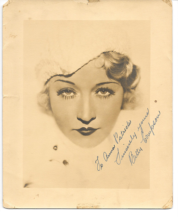 COMPSON, Betty (1897-1974). Delightful character actress. This red head beauty appeared in many of the early silent comedy shorts. She became one of Hollywood’s top stars. Photograph, 8”x10” full face looking directly into the camera. A most unusual portrait. Beautifully inscribed and signed: “To Anna Patrick, Sincerely yours, Betty Compson”. Little wear to all four corners from prior mounting, small piece top left corner missing and light tape stains top and bottom center. All defects easily matted out. Dated “1933” on verso....................................................$185.00