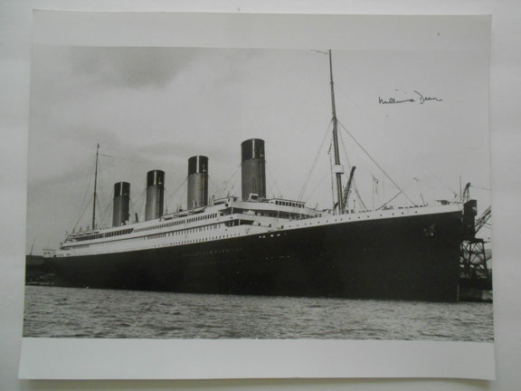 DEAN, Millvina (1912-2009). British citizen, last surviving passenger of the R.M.S. Titanic. Some believe she was the youngest passenger aboard. In 2009 she was cremated, and her ashes was scattered in Southampton, England. Superb extra-large photograph of the Titanic, 11”x14”, full length and hand signed by Millvina Dean. It is estimated that only 25 of these photographs were signed by her. Accompanied by a photograph of Dean signing these photographs. In mint condition...........$175.00