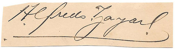De ZAYAS y ALFONSO, Alfredo (1861-1934). Lawyer, poet and politician. Mayor of Havana. President of the Senate (1906), Vice President (1908-1913). President of Cuba (1921-1925). He was arrested and sent to prison during the Cuban War of independence. On October 10, 1922 he launched “PWX” the first Cuban radio station. He allowed full freedom of expression and of the press. A choice signature cut from a letter. Rather uncommon................$185.00