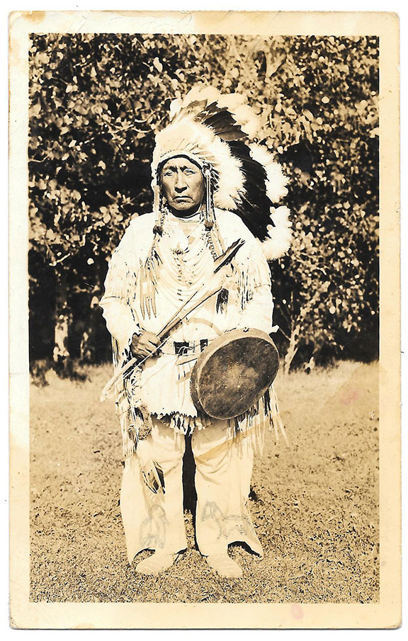 Eagle Chief. American Indian Chief. Postcard photograph, B&W, full length pose in full Indian dress and holding his bow and arrows. Signed in pictograph just above his moccasins. Fine................$95.00