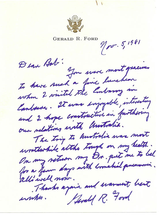 FORD, Gerald R. (1913-2006). 38th President of the United States (1974-1977). As Vice-President he acceded to the Presidency upon the resignation of Richard Nixon. This was a first in American history. President Ford pardoned former president Richard M. Nixon. Wonderful autograph letter signed, one full page on is name imprinted stationery. Nov. 5, 1981. He writes to Robert Nesen, Ambassador from the U.S. to Australia. Ford writes: “Dear Bob, You were most gracious to have such a fine luncheon when I visited the Embassy in Canberra. It was enjoyable, interesting and I hope constructive in furthering our relations with Australia. The trip to Australia was most worthwhile although tough on my health. On my return my Dr. put me to bed for a few days with bronchial pneumonia. All’s well now. Thanks again and warmest best wishes. Gerald R. Ford.” One crease on the left margin, never been folded............................. $1,495.00