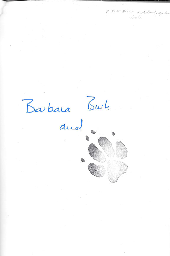 BUSH, C. Fred ( 1985-1997). First Dog in the George H.W. and Barbara Bush White House. C. Fred Bush died of pneumonia in 1997 at the age of twelve. The dog’s book: “C. Fred’s Story A Dog’s Life.” Edited by Barbara Bush. Doubleday & Company, New York, 1984. One hundred nine pages, heavily illustrated. Signed on the second flyleaf “Barbara Bush and” then signed with a printed paw-print of C. Fred Bush. The First Family reported $1.3 million in income, nearly three-fourths of it from ‘Millie’s Book.’ In very fine condition with a very fine dust jacket in protective cover......................$95.00