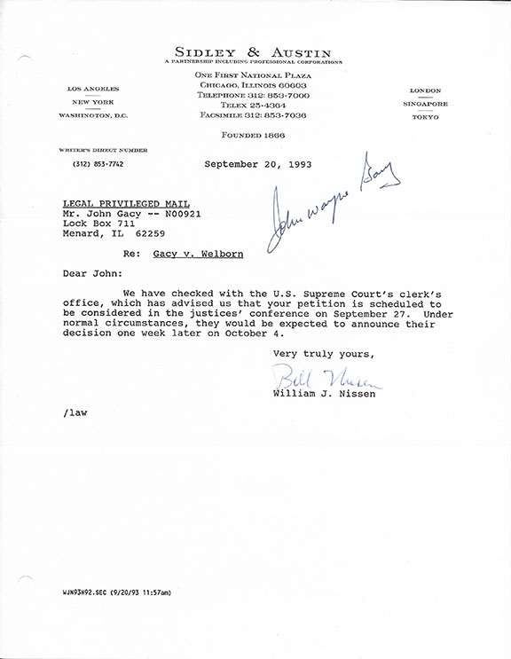 GACY, John Wayne (1942-May 10, 1994). American serial killer who is also known as the “Killer Clown”. He was convicted of sexual assault and murder of at least 33 teenage boys and young men. The killings took place between 1972 and 1978 in the Chicago area. Twenty-six of Gacy’s victims were buried in a crawl space under his home. Three others were buried on his property and the last four were dumped in the Des Plains River. Gacy was convicted of the 33 murders and sentenced to death for 12 of them. He spent 14 years on death row before being executed by lethal injection. Actual page from Gacy’s personal files, kept in his cell, that he signed in full, just a day or two before his execution. Original T.L.S. from his attorney, on attorney’s letterhead dated Sept. 20, 1993, Re: Gacy v. Welborn advising Gacy that that his petition is scheduled to be considered in the justices’ conference on September 27...they would be expected to announce their decision one week later...” Signed in ink by an attorney and signed in full by John Wayne Gacy. Two file holes otherwise in fine condition...............SOLD