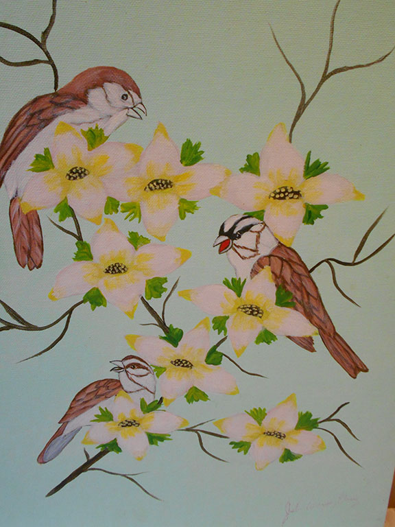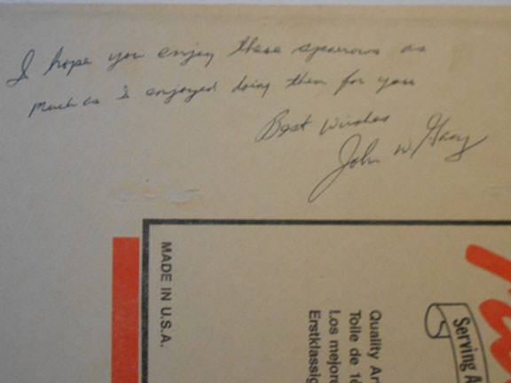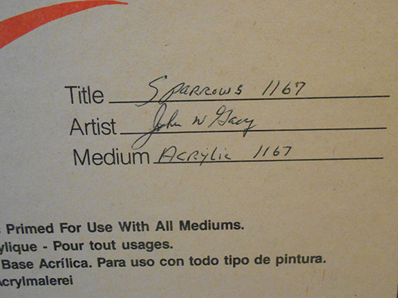 Large size 14”x18.” Three colorful sparrows on some tree branches with flowers. Signed in full using red ink near the bottom right portion of the painting “John Wayne Gacy.” Painted on an Artists Canvas hard panel Gacy has filled in a few lines on the verso: “Title “Sparrows 1167” Artist he signs his name “John W. Gacy” and Medium, he writes “Acrylic 1167.” In addition, he writes “I hope you enjoy these sparrows as much as I enjoyed doing them for you Best wishes John W. Gacy.” This three line inscription was the idea of Stephen Koschal and Gacy would write similar inscriptions on all paintings ordered by Koschal. Well executed and in very fine condition...............SOLD