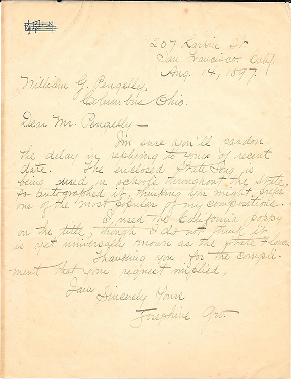 GRO, Josephine American songwriter and composer. Of her works, her most popular song was for the State of California “Hail California” written in 1896. Very rare autograph letter signed, one page, San Francisco, California, Aug. 14, 1897. To William G. Pengelly, Columbus, Ohio. Gro writes in part: “The enclosed State Song is being used in schools throughout the State, so autographing it, thinking you might prefer one of the most popular of my compositions. I used the California Poppy on the title, though I do not think it is yet universally known as the State Flower....Josephine Gro”.