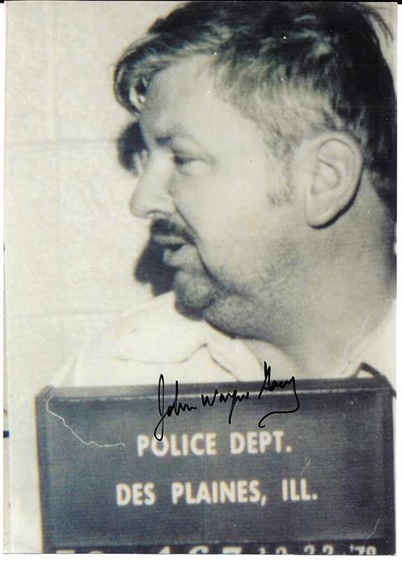 GACY, John Wayne (1942-1994). Convicted and executed mass murderer. The most savage, cruel, inhumane killer of 33 young boys and likely more. Professional clown. During 1982, while in prison, Gacy began painting and his artwork is collected around the world with some paintings selling as high as $75,000. He was executed by lethal injection on May 10, 1994. Reproduction photograph, appx. 7”x9” B&W, uncommon Police department, des Plains, Illinois mug shot of Gacy. Signed in full. Rare....................................................SOLD