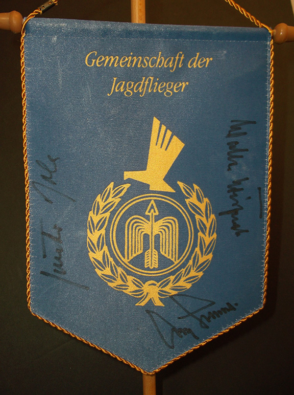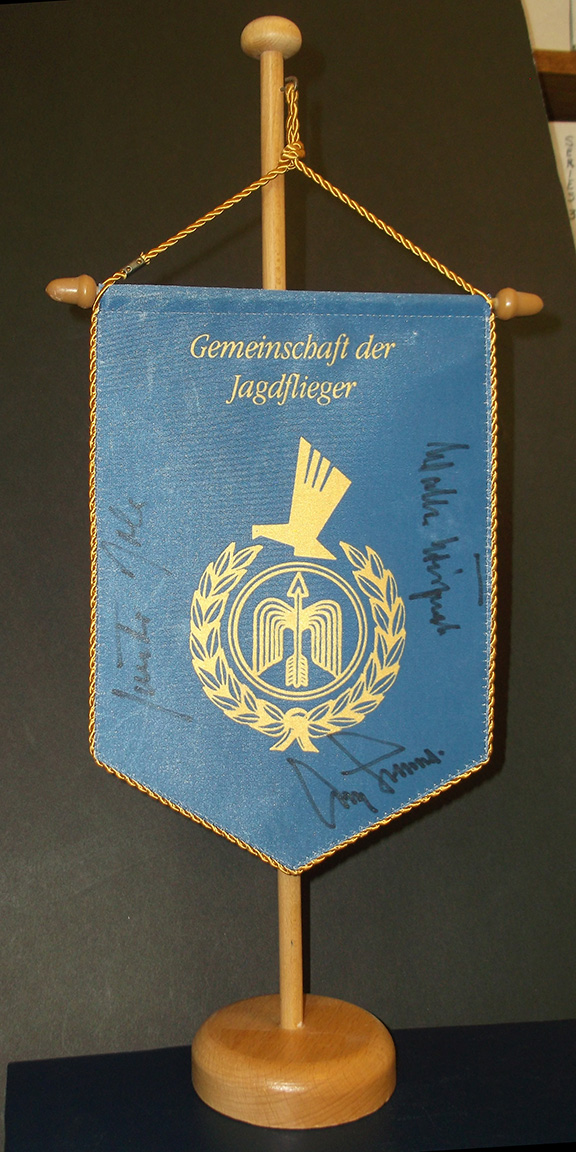 Aldolf Galland’s personal table flag which was on display in front of him on the dias at the Luftwaffe meeting “Gemeinschaft der Jagdflieger”. This flag is edged in gold cord. The flag hangs from a wood flag pole. This flag was a gift to Stephen Koschal after the Luftwaffe reunion dinner meeting. The flag is hand signed with “in person” signatures from Galland, Krupinski and Rall. One of a kind! A fabulous display item................................SOLD