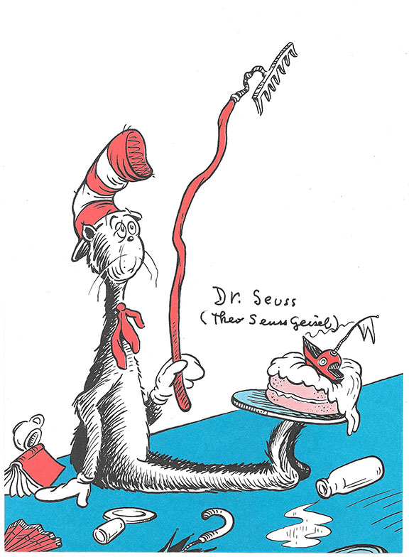 GEISEL, Theodore (Dr. Seuss) (1904-1992). Author, illustrator of children’s books. Creator of The Cat in the Hat. Color portrait of The Cat in the Hat holding a rake with a crooked handle. Signed with his very scarce double signature “Dr. Seuss, Theodore Geisel.” Measures 6”x9”. This is from a fabulous Miami collection of over 30 signed pieces by Dr. Seuss. This was the only double signed item in the collection. In choice condition, would look fabulous framed........SOLD