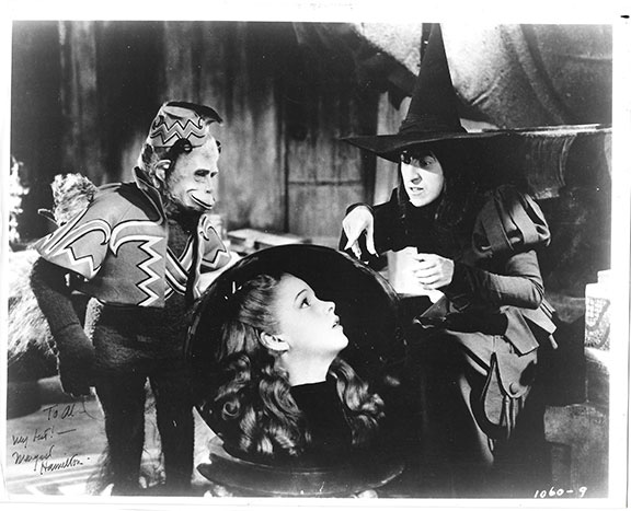 HAMILTON, Margaret (1902-1985). American actress, Cleveland kindergarten teacher who turned to Hollywood in 1933. Best remembered for her role as the Wicked Witch of the West in the Wizard of Oz. Photograph, 8”x10”, B&W of Hamilton as the Wicked Witch looking at Judy Garland in her crystal ball. Inscribed and signed: “To Al, My best! --Margaret Hamilton.” In near fine condition..................................SOLD |