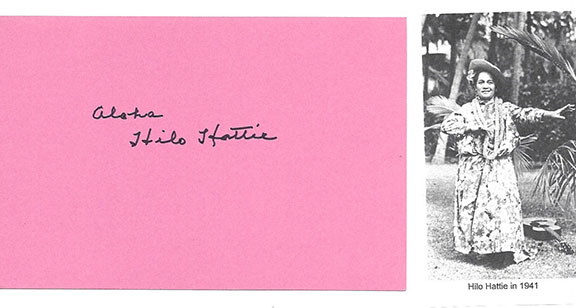 HILO, Hatti (1901-1979). Actress, singer, comedian and hula dancer. She became an icon for her music and dancing. Hatti was a favorite of the military. Of Hawaiian decent, she entered into the movies in the early 1940’s. She appeared in “Song of the Islands” (1942) and in ‘”Blue Hawaii” (1961) with Elvis Presley. In 1969 a new hybrid orchid was named after her. There are seven Hilo Hatti retail stores in the state of Hawaii which is a major tourist destination. A pink 4”x6” card signed “Aloha Hilo Hatti.” A very scarce autograph in excellent condition. Note on verso states this card was signed on Thursday 15 November 1973...................95.00