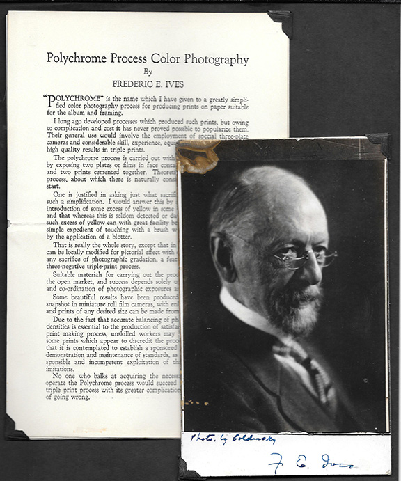 IVES, Frederic Eugene (1856-1937). American inventor, pioneer in modern photography. He popularized the color print making process (Ives Process) (Ives Polychrome Process). For years he studied to reproduce nature “as it is.” In 1881 he commenced the manufacture of half-tone process printing plates. He is the creator of the Ives Tripak Camera which was a milestone in the development of three-color process photography. A letter from George Eastman in Feb. 1931 to Ives said: “You have been an important factor in making photography a great art, and I am writing you on having lived to see universal use made of one of your inventions which has multiplied the use of photography far beyond what would have been possible without your work.” Photograph, cabinet size, B&W, head & shoulders pose. Written in ink on the lower white margin: “Photo by Goldens, N.Y.” Signed on the lower white margin “F.E. Ives.” A small circular discoloration, size of a penny on the very top left corner on the black background. Very light brushing to parts of his last name. Together with several pages from The Autobiography of an Amateur Photographer which are very informative leafs regarding the work of this great inventor. Signatures of Ives are quite scarce in any form and signed photographs can be considered rare........$250.00