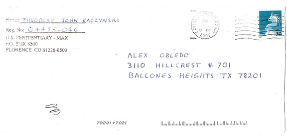 KACZYNSKI, Theodore (1942- ) Serial bomber known as the “Unabomber.” He committed 16 bomb attacks on universities and airlines in a space that lasted 20 years. He killed three people and injured 23others. Kaczynski was given a life sentence. He was a former assistant professor of mathematics, an intellectual child prodigy who was accepted into Harvard when only 16 years old. He lived as a recluse in a one room cabin in Lincoln, Montana. It had no plumbing or electricity. This is where he learned his survival skills. He was the target of one of the F.B.I.‘s most costly investigation. It was his brother and wife who tipped off the F.B.I. The F.B.I. designated Kaczynski and a “Domestic Terrorist.” Legal size envelope, hand addressed by Kaczynski to a Texas collector. In the upper left corner Kaczynski has written his full name “Theodore John Kaczynski” and added his Prison Number. Return printed address “U.S. Penitentiary-Max, Florence, Co. Postmarked, June 24, 2005. In very good condition. Full signatures of Theodore Kaczynski are rare as his signature is usually as “Ted.”..............................SOLD