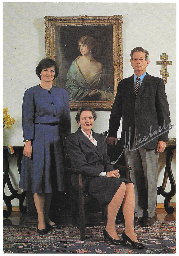 KING MICHAEL OF ROMANIA (1921- ) King of Romania (1927-30) and again (1940- ). Forced to abdicate in 1947. He is the great grandson of Queen Victoria of England. Michael had lunch with Hitler twice but he proclaimed Romania’s loyalty to the Allies. He was decorated awards by both Hitler and Stalin. Color photograph, 4”x6”, full length pose of King Michael with Queen Ana and Princess Margareta. Signed using a silver ink pen thus offering excellent contrast. In very fine condition................................. $100.00
