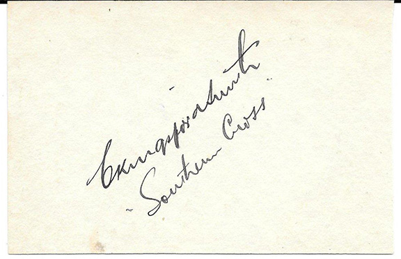 KINGSFORD-SMITH, Sir Charles (1897-1935). Australian aviator, served with the RFC in WWI. Ace, credited with 5 victories. He made the first U.S./Australia Pacific flight (1928) in his famous aircraft the “Southern Cross”. He was lost en-route to Singapore in an attempted flight from England to Australia. A fine signature on a large card adding “Southern Cross” in his hand. Perfect for framing................SOLD![]() |