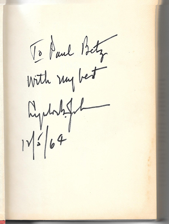 William S. White’s book “The Professional Lyndon B. Johnson” Houghton and Mifflin Co. 1964, fourth printing. Inscribed to Paul Betz and signed and dated “12/5/64” (as President) by Johnson. At the time, Paul Betz was 20 years old, a pre-medical student who courted First daughter Luci Baines Johnson when she was 17 years old. Paul Betz escorted Luci to her father’s inaugural ball. This book was signed shortly after LBJ signed the Civil Rights Bill into law. This may be the only book of this title signed by Johnson as President. Only a handful of this title contains a genuine signature of Johnson. Almost every book of this title that comes on the market is inscribed and signed by Johnson’s secretary. A fine copy with dust jacket..............................SOLD