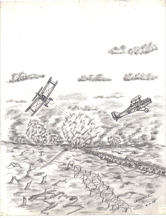 Original pencil drawing given to the publisher to be used in the book. This drawing is of two fighter planes being shot at by soldiers from the trenches. Signed and dated by Lambert: “Lambert 4-7-18”. Includes a full COA from William E. Martin, a consultant for Lambert’s book. This illustration which measures appx. 8”x11” was not one of those used in the book. In fine condition...............................$495.00