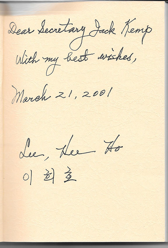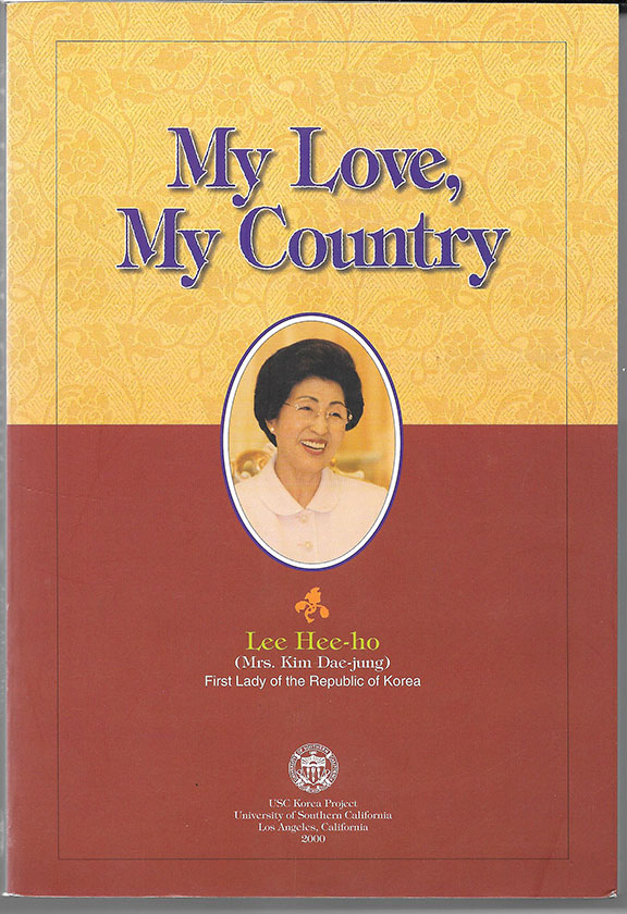 LEE HEE-ho (Mrs. Kim Dae-jung) (1922- ) First Lady of the Republic of Korea (1998-203). Her book: My Love, My Country. Los Angeles, 2000, 269 pages, illustrated. Soft cover. This book is a glimpse into the tumultuous lives of Korea’s foremost family in the 30 years struggle for their nation’s democracy. She writes of her husband’s persecution, imprisonment, house arrests, death sentence and kidnapping under Korea’s dictators. Inscribed to Housing Secretary Jack Kemp under George Herbert Walker Bush (1935-2009). Kemp was also the AFL’s Most valuable Player 91965) and the V/P nominee running mate for Bob Dole. Signed by the Former First Lady in English and Korean. Excellent condition......SOLD