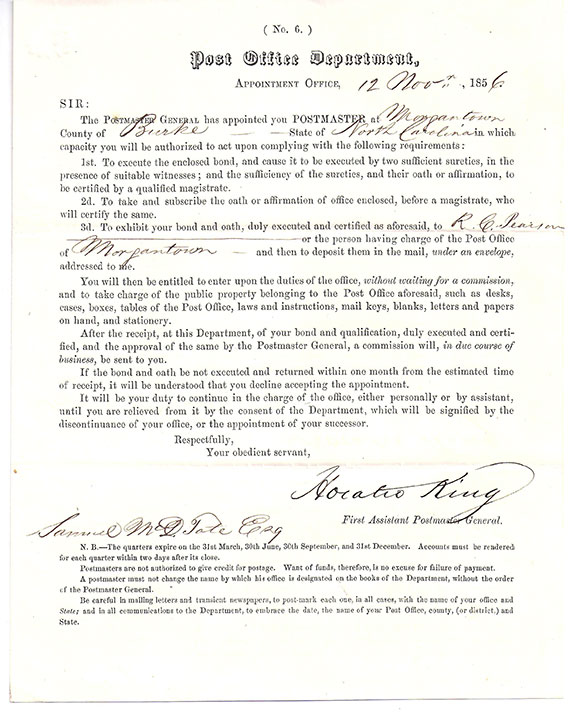 Horatio King, Postmaster General, P.O. Department document appointment, signed.