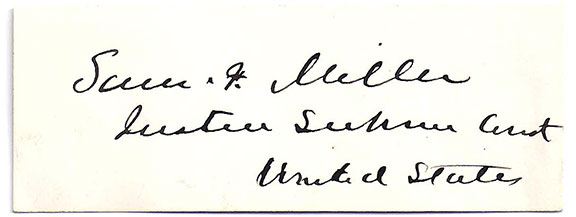 Samuel Miller, Associate Justice, signature “Justice Supreme Court” in his hand.