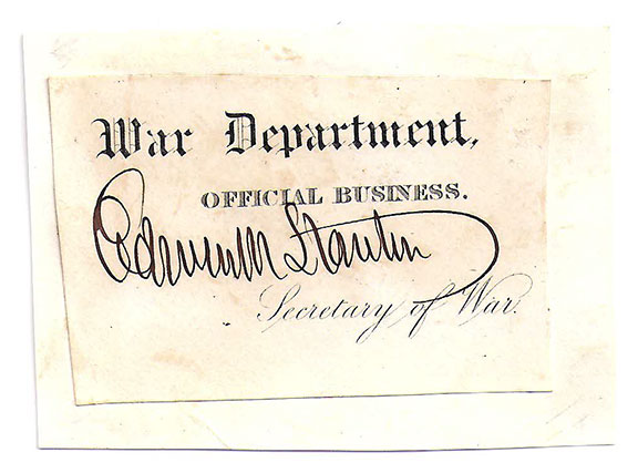 Edward Stanton, Secretary of War, fabulous signature on War Dept. slip, as Sec. of War.