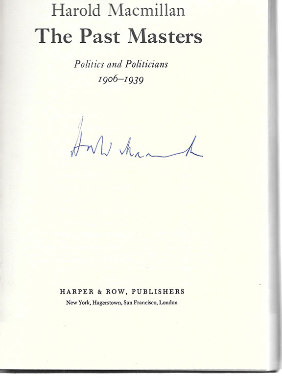 MACMILLAN, Harold (1894-1986). British politician, Prime Minister of the United Kingdom (1957-1963). His book: “Harold MacMillan The Past Masters.” Harper & Row, 1975, First U.S. Edition. Two hundred forty pages, illustrated. Signed by Harold MacMillan on the title page. A fine copy with the dust jacket..........$85.00![]() ![]() |
