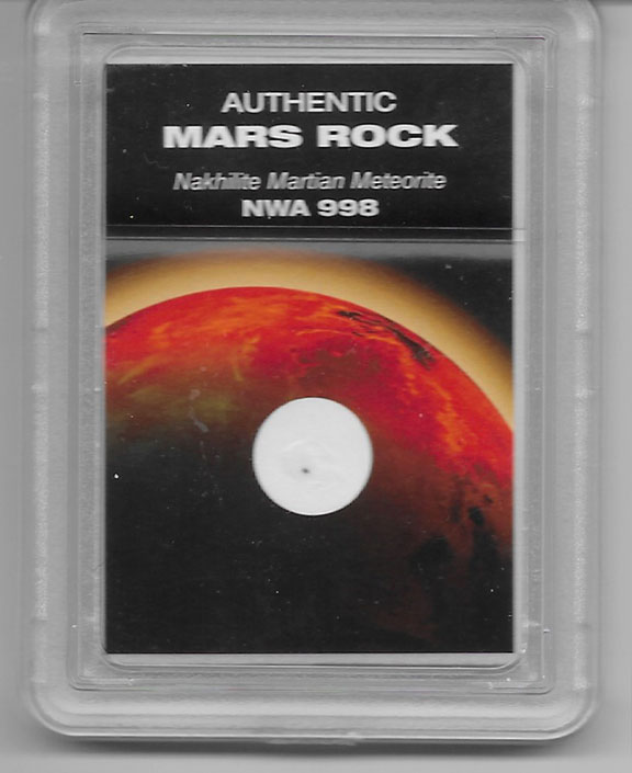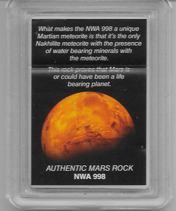 Mars Rock, Authentic small piece of authentic Nakhilite Martian Meteorite, NWA 998. This is the only Martian Nakhilite meteorite that has the presence of water bearing minerals. This rock proves that Mars is or could have been a life bearing planet. Attractively encased in a collector’s protective holder. In mint condition.........$39.00