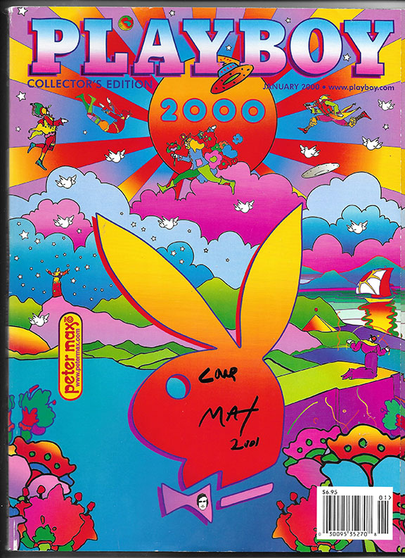 MAX, Peter (1937- Rumors say he may have died August 26,2023). American artist of German and Jewish origin. His work is associated with the culture of the 1960’s, particularly psychedelic and pop art. Max’s wife Mary who committed suicide in 2019, along with her husband, allegedly siphoned 4.6 million dollars in cash from a relative. PLAYBOY magazine, Collector’s Edition, January 2000, a whopping 284 pages, with the colorful art work of the Playboy Bunny on the cover. Interesting content including the famous interview with Hugh Hefner and illustrations of the 100 Centerfolds of the Century. Hand signed on the cover of the Playboy Bunny using a black ink Sharpie Pen: “Love Max 2001.” In very good condition.........$195.00