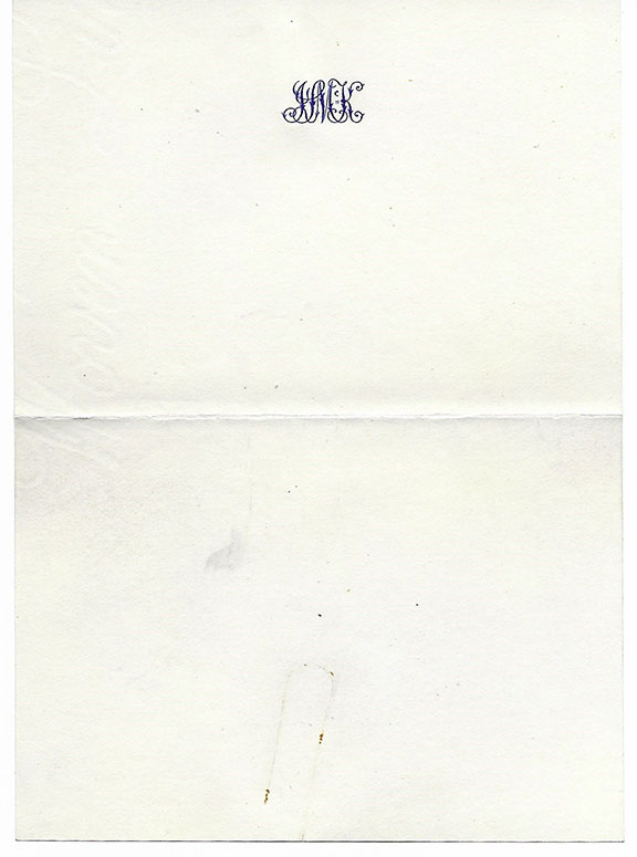 McKINLEY, Ida (1847-1907). First Lady of the United States ((1897-1901). She lived through her only brother’s murder. She did not attend her husband’s funeral. Genuine sheet of note paper, unused. Her initials in blue (IMK) top center. Quite scarce. One fold otherwise in V/G condition........$22.50![]() |