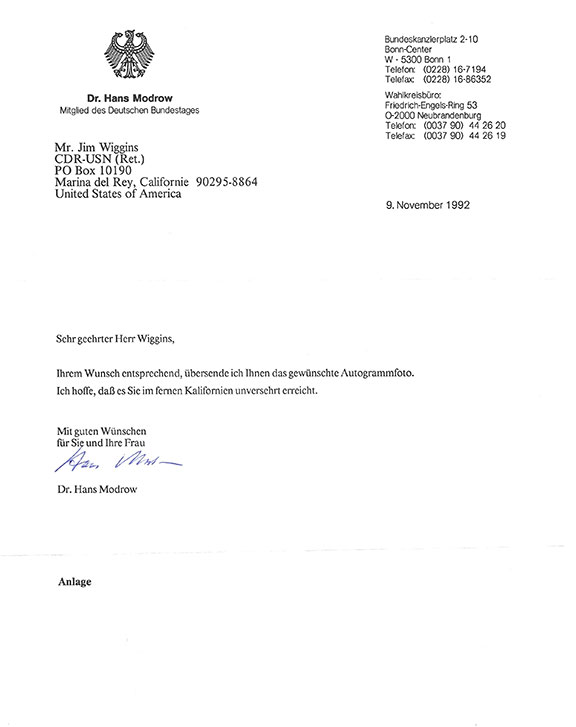MODROW, Dr. Hans (1928- ) The last Premier of East Germany. He paved the way to the first and only free elections in East Germany. Modrow defended the construction of the Berlin Wall as a necessary measure to prevent WWIII. He blamed West Germany for the East Germans killed by the communist regime at the Berlin Wall. He was convicted of electoral fraud and perjury in May 1993 by the Dresden District Court. Later he was convicted of abuse of office. Since the premiership was the highest state post in East Germany, Modrow became the de facto leader of the country. Typed letter signed, one page on his ornate letterhead. Neubrandenburg, 9 November 1992, to a Naval Officer in California/ Modrow responds to a request for an autographed photograph. In excellent condition..................$87.50