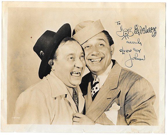 JOHNSON, Harold (1891-1962). Zany, American comedians of vaudeville, radio, Broadway stage and motion pictures. They hit Broadway with their hit “Hellzapoppin” which was later turned into a film. Wonderful vintage photo, 8”x10” of the zany duo, head & shoulders pose. Inscribed and signed: “To Joe & Wally merrily Olsen and Johnson”. Not common as such. Light wrinkling and some remnants of prior mounting on verso otherwise very good. Not common in signed photographs.........$125.00