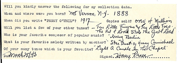 PEASE, Harry (1888-1945). Noted composer, best known for writing Irish-American songs. His best known hit was “Peggy O’Neil” (1917). This song sold over 4 million copies. Questionnaire containing six questions. He writes in ink his birth date, two of his favorite tunes, the year he wrote “Peggy O’Neil”, his favorite composer, favorite melody and the favorite tune he wrote. Signed and dated “March 25/43”. Most unusual...............................$60.00![]() |