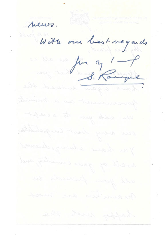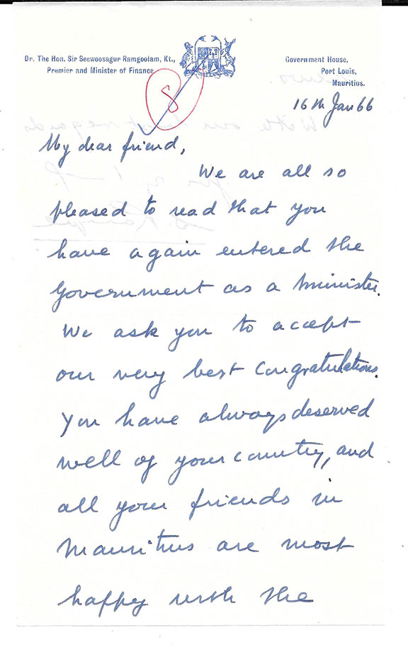 RAMGOOLAM, Seewoosagur (1900-1985). He led Mauritius (island nation in the Indian Ocean off the coast of Africa) to Independence in 1968. The island was uninhabited until 1638. Run by the Dutch and then a French Colony named Isle de France. The island gained its independence from the British with Ramgoolam becoming its first Prime Minister (1968-82) with Queen Elizabeth remaining head of state. Very scarce autograph letter signed, one and a half pages on the letterhead of Premier and Minister of Finance, 16 January 1966. Ramgoolam writes: “We are all so pleased to read that you have again entered the government as a minister. We ask you to accept our very best congratulations. You have always deserved well of your country, and all your friends in Mauritius are most happy with the news. With our best regards, yours truly, S. Ramgoolam.” In very good condition..........................$145.00 |