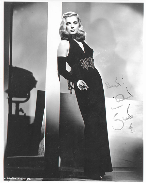 SCOTT, Lizabeth (1922-2015). American actress and model. Known for her smokey voice and being the most beautiful face of the films of the 40’s and 50’s. Of her 22 films she was the leading lady in all but one. Fabulous, sexy full length black and white photograph 8”x10”, full length of Scott holding a cigarette. She writes: “Best wishes L. Scott.” In fine condition......................$75.00