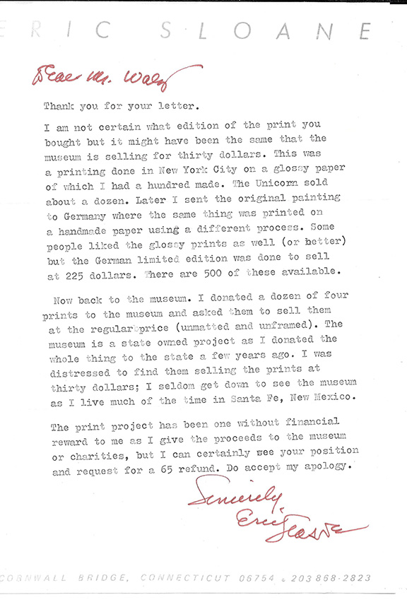 SLOAN, Eric (1905-1985). American landscape painter, illustrator. Choice typed letter signed, one full page on his name/address imprinted letterhead. In his hand he writes: “Dear Mr. Walz”. Sloan sends thanks for a letter and continues: “I am not certain what edition of the print you bought but it might have been the same that the museum is selling for thirty dollars. This was a printing done in New York City on a glossy paper of which I had a hundred made. The Unicorn sold about a dozen. Later I sent the original painting to Germany where the same thing was printed on a handmade paper using a different process. Some people liked the glossy prints as well (or better) but the German limited edition was done to sell at 225 dollars. There are 500 of these available. Now back to the museum, I donated a dozen of four prints to the museum and asked them to sell them at the regular price (unmated and unframed). The museum is a state owned project as I donated the whole thing to the state a few years ago. I was distressed to find them selling the prints at thirty dollars; I seldom get down to see the museum as I live much of the time in Santa Fe, New Mexico. The print project has been one without financial reward to me as I give the proceeds to the museum or charities, but I can certainly see your position and request for a 65 refund. Do accept my apology.” Signed: “Sincerely Eric Sloan”. A wonderful content letter in excellent condition...........................$125.00