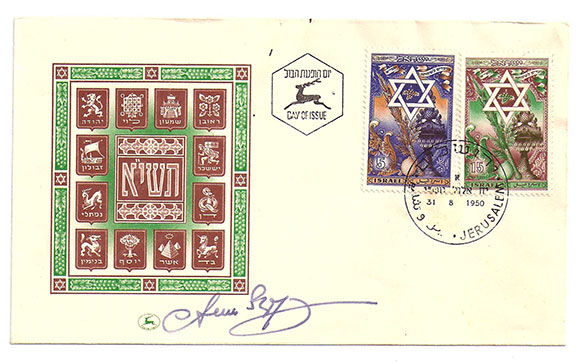 SZYK, Arthur (1894-Sept. 13, 1951) Polish-American miniaturist and cartoonist and illustrator. As a child of six years old he started drawing. During WWI he was a highly decorated soldier who fought with the Russian Army before escaping. He is best remembered for his miniature book illustrations and illustrating many Israeli postage stamps. Some of his original works include “George Washington and His Times” (19310 which hung in The White House under the FDR administration. Another is his “Visual History of Israel” commemorating the Birth of the New Nation. (1948). Very colorful Israeli cover, First Day of Issue of the 5 and 15 cent Israeli stamps designed by Szyk. Postmarked Jerusalem 31.8.1950. Not common as Szyk signed this cover just a year before his early death. Fine condition...........................$65.00
