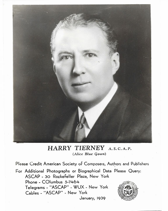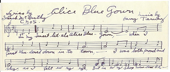 TIERNEY, Harry (1890-1965). Composer of Broadway Musicals during the 1920’s. In 1919 he wrote the songs for “Irene” which became one of America’s most treasured musicals. Alice Blue Gown is one of the best known and favorite songs from that play. AMuQS, 3.75”X9” music lined card with a whopping fifteen bars of music along with the words from Akice Blue Gown. Harry Tierney has added “Lyrics by Joseph McCarthy, music by Harry Tierney. A fabulous item in excellent condition.......$350.00 |