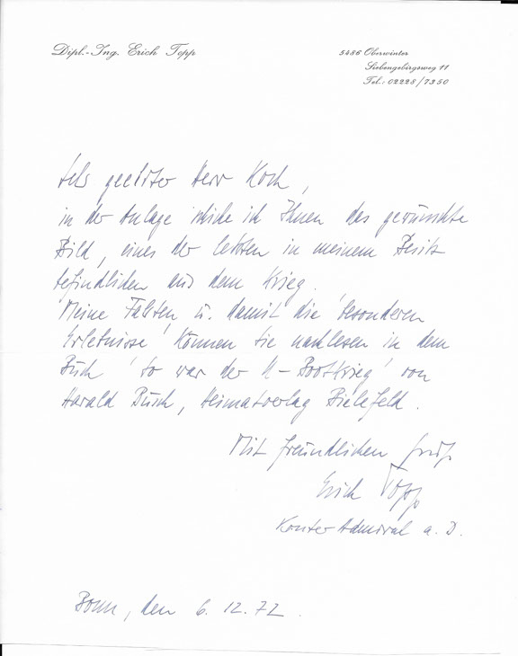 TOPP, Erich (1914-2005) Third most successful German U-Boat Commander of WWII. Recipient of the Knights Cross of the Iron Cross with Oak Leaves and Swords. He sunk 35 ships. Topp joined the Nazi Party in 1933. He became a Rear Admiral of the German Navy. He is noted for the sinking of the destroyer USS Reuben James on October 31, 1941. This was the first USN warship to be lost. On December 11, 1941, Hitler declared war on the United States. Topp was very critical of his superior Karl Donitz. At one time Donitz greeted Topp with a question: “I, understand you think I should have been executed?” Scarce autograph letter signed, one very full page, on his Diplomatic letterhead. Bonn, 6/12/72, Topp writes in German, translated: “Dear Mr. Koch, Please find enclosed the personal picture which is one of the last I have from the war. You can read facts about me including my special ex-prisoner in the Bookmans Such Was The Submarine War by Harold Busch, Heimat Publishing Company, Bielfeld. Kind Regards, Eric Topp,Rear Admiral, Ret.” In very fine condition...........$185.00