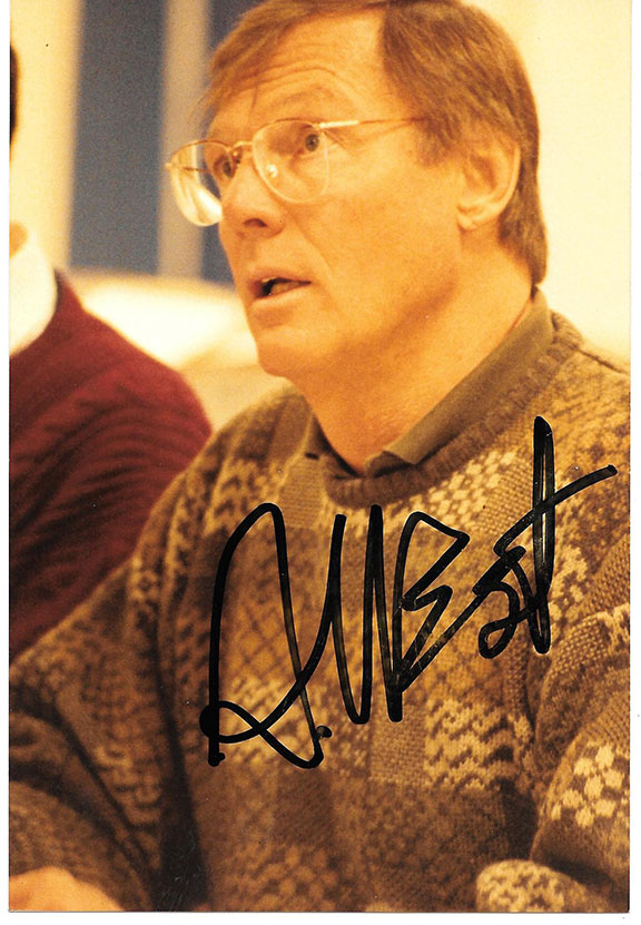 TV’S Batman WEST, Adam (1928-2017) American actor, played the part of “Batman” in the 1960’s TV series of the same name. Color photo, candid shot, half length pose of Adam West. Boldly signed. Mint condition........$37.50 |
