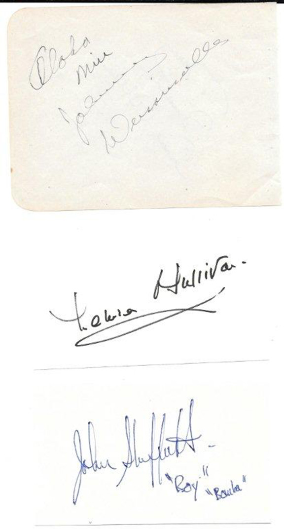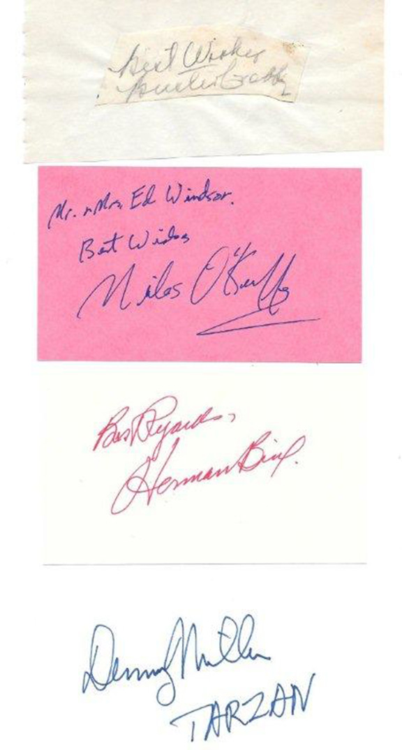 O’SULLIVAN, Maureen (1911-1998). Actress best known for playing “Jane”. Choice signature on a 3”x5” card. SHEFFIELD, John (1931-2010) American child actor, played “Boy” in early Tarzan films. Choice signature on a 3”x5” card adding “Boy” and “Bomba”. CRABBE, Buster (1908-1983). Actor, swimmer, won the 1932 Olympic Gold Medal. Played Tarzan, Buck Rogers and Flash Gordon. “Best Wishes, Buster Crabbe” in pencil on a slip affixed to an old album page. BRIX, Herman (1906-2007). Actor, in 1928 Olympics won Silver medal for shot put. Played “Tarzan” in films, changed his name to Bruce Bennett. Fabulous two word sentiment, signed “Best Regards, Herman Brix” on a 3”x5” card. MILLER, Denny (1934-2014). Actor, played “Tarzan” in 1959 film. His bold signature “Denny Miller, Tarzan” on a 3”x5” card. O’KEEFFE, Miles (1954- ) Television and movie actor. Played title role in “Tarzan, The Ape Man”. Inscription, sentiment and signature on a 3”x5” card. The collection..................$295.00 ![]() |