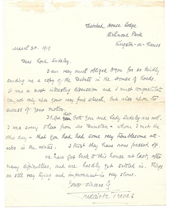 TREVES, Sir Frederick (1853-1923). Famous pioneer in abdominal surgery. Surgeon extraordinary to Queen Victoria. In 1902, he performed an appendectomy on King Edward VII. Personal friend, physician and confident to John Merrick, better known as “The Elephant Man.” A Broadway Play and movie was produced about the relationship between Treves and Merrick. Autograph letter signed, one very full page, dated March 30,1919 to Lord Sudley. Treves writes in part: “...I am very much obliged to you for so kindly sending me a copy of the debate in the House of Lords. It was a most interesting discussion and I must congratulate you, not only for your very fine speech, but also upon the success of your motion...I was sorry to hear...that you had had some very troublesome attacks in the winter. I trust they have now passed off. We have got back to this house, after many difficulties, and are hardly yet settled in. Things are still very trying and improvement is very slow.” A little remnants from mounting along the blank top area otherwise in very good condition......... $395.00