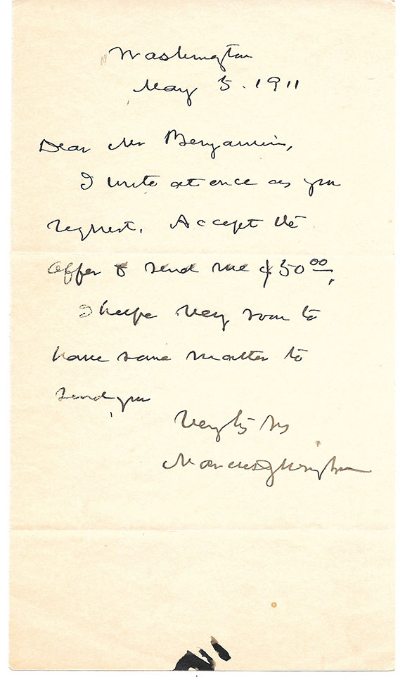 WRIGHT, Marcus J. (1831-1922). Confederate General during the Civil War, lawyer and author. He was agent for the Collection of Records for the War of the Rebellion. This was the official records of the Union and Confederate Armies. He was ordered to establish a fortification at Randolf, Tennessee on the Mississippi River. Fort Wright was Tennessee’s first military training camp in the Civil War. He was wounded at the battle of Shiloh. He was also in charge of the district of Atlanta. After the evacuation of Atlanta he was in command at Macon, Georgia. He is buried in Arlington National Cemetery and is only one of two Confederate Generals interred in the cemetery. Very fine autograph letter signed, one page, Washington, May 5, 1911. To: “Dear Mr. (Walter) Benjamin”. He continues: “I write at once as you request. Accept the offer and send me $50.00. I hope very soon to have some matter to send you. Very truly yours, Marcus J. Wright.”............$245.00