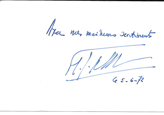 ABBAS, Ferhat  (1899-1985).  First President of the Provisional Government of Algerian Republic (1958-1961).  He was placed under house arrest twice (1964-65) and (1976-79).  Four word sentiment signed and dated “5.6.72”.  Fine condition, signatures of Abbas can be considered scarce......................