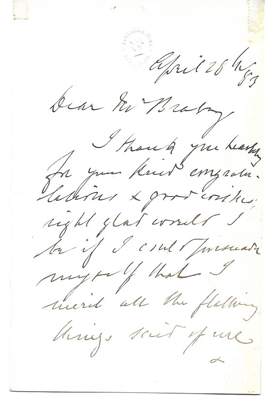 ABEL, Sir Frederick Augustus (1827-1902). British chemist, inventor of cordite, author of works on explosives. Autograph letter signed, 2 pages, Athenaeum, Pall Mall, 28 April 1883. To Sir Frederick Braby, thanking him profusely for his congratulations. Minor corner mountings otherwise near fine condition. Cordite was invented by Abel in 1889 which replaced gun powder for the military.................$185.00