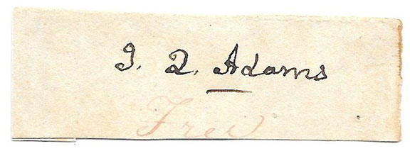 ADAMS, John Quincy (1767-1848). Sixth President of the United States. Son of President John Adams. Choice signature “J.Q. Adams” on a .75”x2.5” slip. Written under his signature in red ink “Free.”..................SOLD