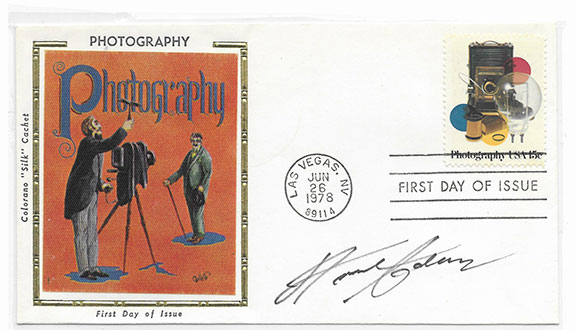 ADAMS, Ansel (1902-1984). Considered the most important landscape photographer of the 20th century. First Day Cover commemorating the First Day of Issue of the U.S. 15 cent photography postage stamp. Wonderful, colorful silk cachet of an old-time photographer taking a picture. The postage stamp is cancelled First Day of Issue, Las Vegas, NV Jun 1978. Boldly signed by Ansel Adams in a clear area of the cover. Very fine condition.....................$350.00![]() |